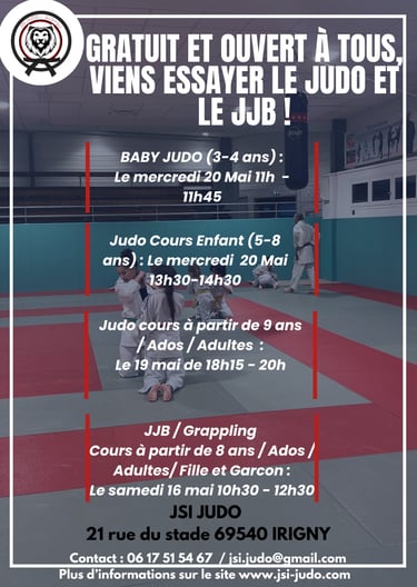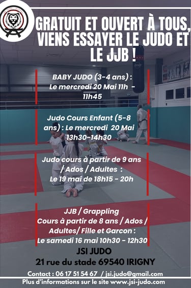 Le club JSI Judo a le plaisir d’ouvrir ses portes à tous pour des séances gratuites de découverte du judo et du JJB (jiu-jitsu brésilien) !